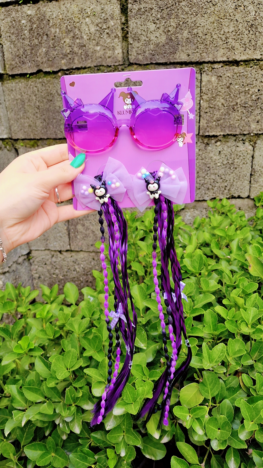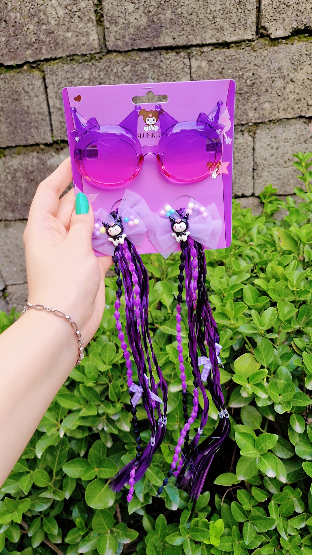 دو عدد کش مو آویزدار با پاپیونهای حریری و مهرههای رنگی بنفش و مشکی، تزئینشده با تصویر شخصیت محبوب «کرومی».