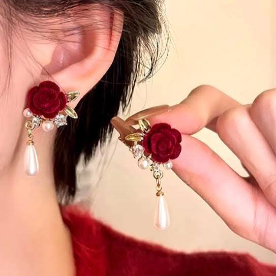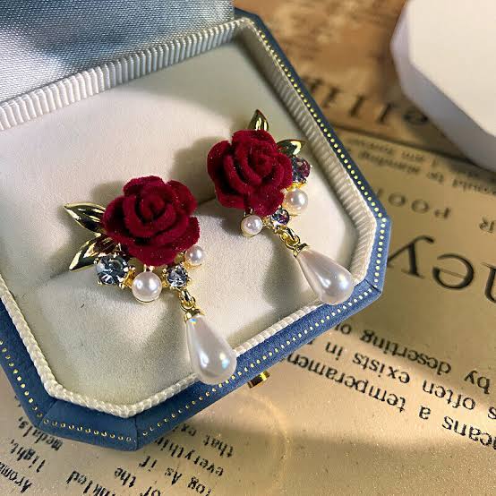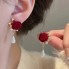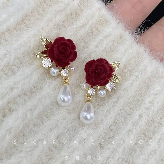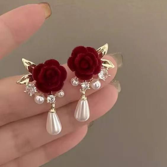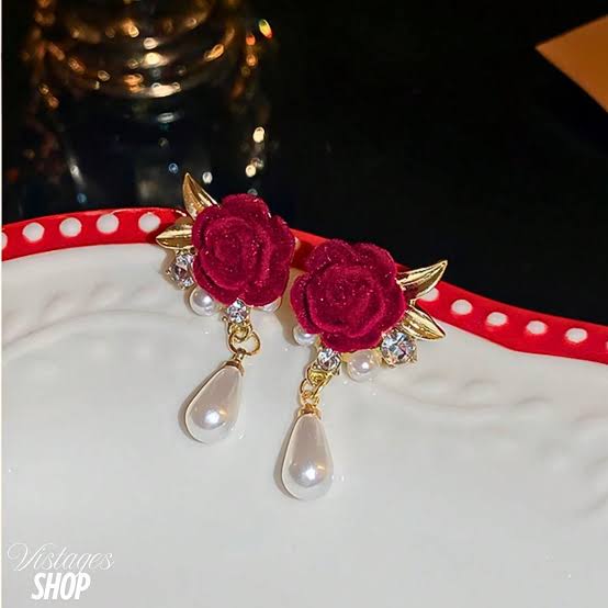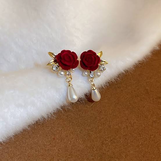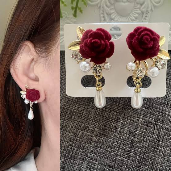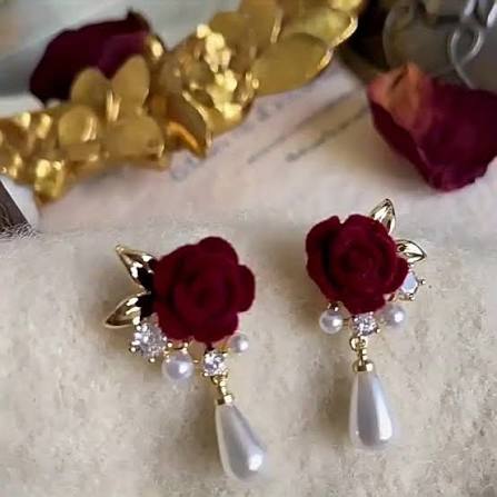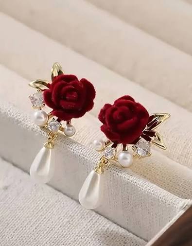 ترکیب گل رز مخملی با مروارید های زیبا و رنگ ثابت اطراف آن باعث شده این گوشواره جز پرطرفدار ترین و پرفروش ترین مدل های ترند پینترستی باشد